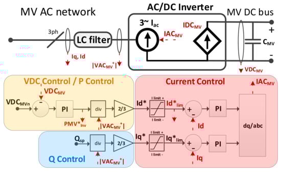 The model of ST’s MV inverter is illustrated in Figure 3. The power stage of the MV inverter (AC/DC Inverter) and the coupling LC filter are modeled following the assumptions adopted in [27] for the grid-tied ST, where the DAM technique is also adopted. No neutral connection was considered for the MV inverter.