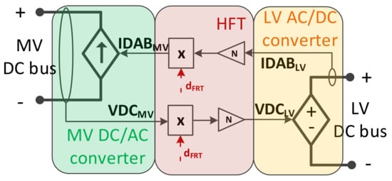 The isolated DC/DC converter was modeled according to the approach presented in [31], following the considerations described in [26]. The resulting model is depicted in Figure 4 and expressed in Equations (3) and (4), where and are the voltages in the HFT, and are the nominal voltages for the ST’s MV and LV DC buses respectively, and are the currents in the HFT’s primary and secondary stages respectively, and is the duty-cycle adjustment signal.