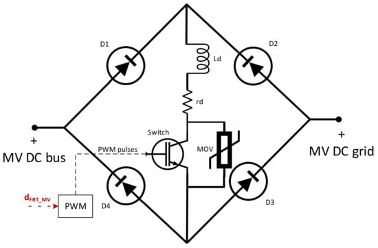 The FCL proposed in [32] provides a simple structure based on a four-diode bridge, a single electronic switching device, an inductor ( and model the inductance and resistance of the inductor) and a resistor (used for current limiting). The following changes were made to the FCL device described in [32] in order to obtain an electronic resistor device suited to the purpose intended in this paper. Instead of being operated in on/off operation (no fault/fault conditions), the electronic switch is operated in switching mode at the given switching frequency (), commanded by a PWM controlled by the duty-cycle signal generated by the FRT control described in Section 3. To control the MV DC grid voltage from near zero to , the current limiting resistor is replaced by a Metal-oxide varistor (MOV), whose impedance is much higher than the equivalent impedance of the MV DC grid for a MOV voltage below its clamping voltage, but much lower that the equivalent impedance of the MV DC grid for a MOV voltage above its clamping voltage. The inductance is dimensioned considering in order to reduce the current ripple to acceptable magnitudes. The MOV ensures a path for the inductor’s current during electronic switch’s off-state (), protecting the switching device from voltage surges originated by the inductor. The effectiveness of a MOV in this role is shown in [33].