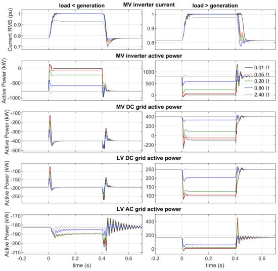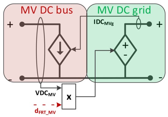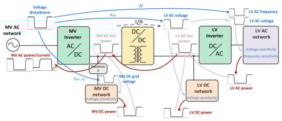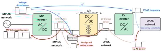 For net load scenarios in the hybrid AC/DC grid, the cascading reaction of the proposed FRT strategy is illustrated in Figure 13. A voltage sag in the MV AC grid causes the FRT control to modulate the voltage and frequency levels in the hybrid AC/DC grid, if the ST’s MV inverter is not capable to balance the power in the hybrid AC/DC grid without violating its current limits. The modulation of the voltage and frequency levels in the hybrid AC/DC grid is aimed to exploit the voltage-power and frequency-power sensitivities of the hybrid AC/DC grid (including voltage-power and frequency-power sensitive modes of DER connected downstream from the ST) in order to reduce the net active power consumption in the hybrid AC/DC network. As a result, the active power in the hybrid AC/DC network that cannot be balanced by the ST’s MV inverter is eliminated. The participation of the MV DC sub-network in this process is made possible by the electronic resistor incorporated in series between the ST’s MV DC bus and the MV DC sub-network. The modeling of the electronic resistor proposed for this purpose is presented in Section 2.1.3.