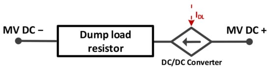 The purpose of the dump-load is to dissipate excessive net generation originated from the hybrid AC/DC network that cannot be delivered to the main power system through the ST’s MV inverter. This may happen when the ST’s MV inverter reaches its technical current limits, namely during fault disturbances in the upstream power system. The dump-load is connected to the ST’s MV DC link and is controlled by the FRT Control described in detail in Section 3. The dump-load is modeled as illustrated in Figure 7. Given the DAM technique was adopted, the electronic converter controlling the power flow in the dump-load’s resistor was modeled using a controlled current source.