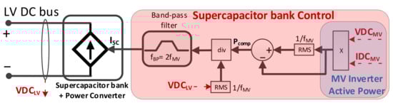 The supercapacitor bank aims to mitigate power oscillations (and thus DC voltage oscillations) in the ST’s DC buses which may result from the occurrence of unbalanced voltage sags in the MV AC grid. The justification for a supercapacitor bank for this purpose is explained in Section 3. The computational model developed for the supercapacitor bank is depicted in Figure 8. The modeling of the supercapacitor bank itself is neglected, based on two considerations. First, it is assumed that its internal dynamics is much faster than the dynamics of the power converter interfacing it with the LV DC bus. Second, as shown in Section 4.1, the energy storage and output power capacities required to address the aforementioned power oscillations can be met by a relatively small supercapacitor bank with a margin sufficiently high to neglect the modeling of any energy and power constraints affecting the supercapacitor bank. Given this, and based on the adopted DAM technique, the supercapacitor bank is modeled as a controlled current source, which represents its interface power converter.