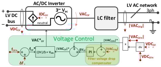 The model of the ST’s LV inverter, responsible to generate the LV AC network (grid-forming operation), is represented in Figure 9. The power stage of the MV inverter AC/DC Inverter) and the LC filter are modeled following the assumptions adopted in [27]. A grounded neutral regime is adopted for the LV AC network.