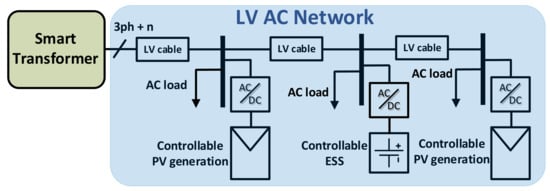 The LV AC network integrating the hybrid AC/DC distribution grid adopts the topology described in [27], represented in Figure 10. Nevertheless, different power levels for the various elements and load voltage sensitivities were considered. The operation of the PV generation with deloading reserve in normal operation conditions is also adopted.