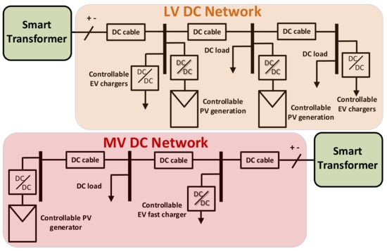The MV DC and LV DC grids were modeled according to the topologies described also in [27] and represented in Figure 11, with the same modifications mentioned in Section 2.2. Contrary to LV AC grids, the estimation of load voltage sensitivity in DC grids remains largely unexplored in the literature, although several works suggest that a large portion the load in DC grids may consist of constant power loads since it is based on power electronic converters [39,40]. Given the lack of data, a scenario with a significant ratio of constant power loads presented in [37] is adopted. In this paper, this adopted scenario is intended to represent the non-controllable DC loads only, modeled according to Equation (23) where is the load power for the nominal voltage (). The controllable EV chargers and PV generation were modeled as constant power and constant current devices according to Equation (24), where is the output current and is the nominal current.