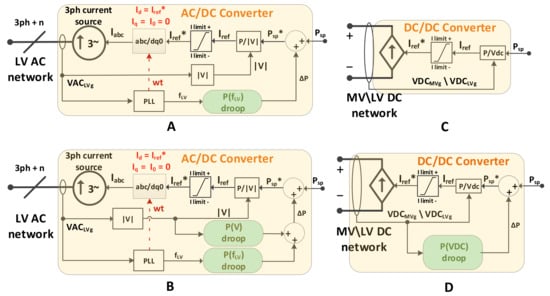 The controllable DER considered in the hybrid AC/DC grid were also modeled following the considerations assumed in [27], and are illustrated in the block diagrams presented in Figure 12: The AC/DC Converter for interfacing the PV generator (Figure 12A) and ESS unit (Figure 12B) with the LV AC network, and the DC/DC Converter for interfacing the EV chargers (Figure 12C) and PV generators (Figure 12D) with the DC networks.