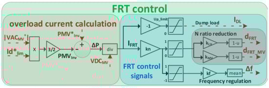 As shown in Figure 13 and Figure 14, the operation of the proposed FRT strategy relies on , , and signals. These signals are generated by the FRT control whose structure is depicted in the block diagram presented in Figure 15. , , and signals depend on the reference signal for the MV inverter overload current , which is calculated according to Equation (25), where is the voltage in the MV DC bus, is the maximum instant active power in the MV inverter, is the unrestricted reference for the active power (generated by the VDC Control / P Control illustrated in Figure 3), is the magnitude of the positive sequence component of the MV AC voltage measured at the ST’s MV inverter (Figure 3)) and is the limited reference for the direct current component (generated by the Current Control illustrated in Figure 3).