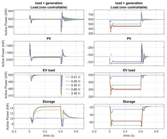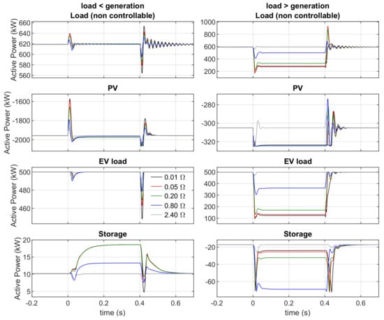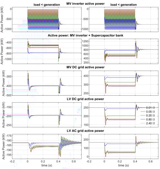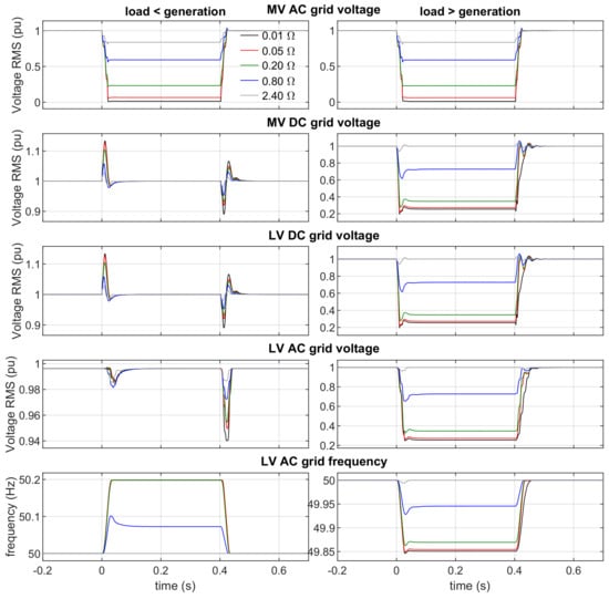 The effectiveness of the proposed strategy is demonstrated for balanced three-phase voltage sags and unbalanced phase–phase and phase-ground voltage sags, while considering also net load and net generation scenarios in the ST’s hybrid AC/DC distribution grid. During net generation scenarios, the proposed FRT control strategy relied successfully on a dump-load do dissipate the excessive net generation in the hybrid AC/DC network, but also exploited the energy storage capacity available in the hybrid AC/DC grid to absorb part of the generation in excess. Regarding net load scenarios, the proposed FRT control strategy modulated the electrical quantities in the hybrid AC/DC grid (voltages in DC and LV AC grids and frequency in LV AC grid), thus exploiting its power-voltage and power-frequency sensitivities in order to eliminate its excessive net load. It also took advantage of PV generation with deloading reserve to reduce the net load in excess, and of energy storage capacity available in the hybrid AC/DC grid which also actively participated in the process by reducing their charging power or by injecting more power to the hybrid AC/DC grid. It is also demonstrated that active power oscillations in the ST’s DC buses resulting from unbalanced faults in the upstream AC power grid can be successfully mitigated.