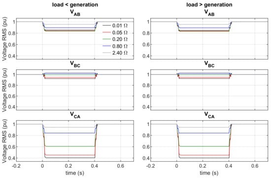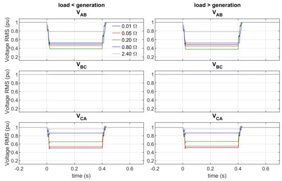 The sensitivity of and to can be adjusted using the gain (see Figure 15). The relative contribution of and can be adjusted using the gains and respectively, with real values between 0 and 1 (see Figure 15). Equal values for and means that and will originate similar per unit voltage reductions in their respective sub-networks. also affects the magnitude of the LV AC grid voltage given its dependence on as depicted in Figure 9. Thus, by reducing and , the FRT mechanism aims to reduce the active power load in the LV DC and LV AC grids by exploiting their power-voltage sensitivity.