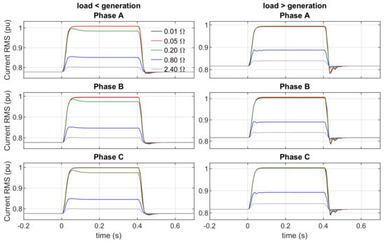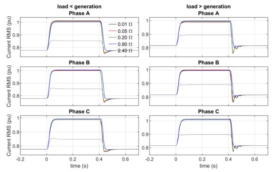 The FRT mechanism is activated when the overload current () is non-zero. While the proposed FRT control strategy relies solely in proportional gains to calibrate the response of each four control signals, it is capable to eliminate the steady-state error due to the dependence of on the PI controller responsible to generate (see VDC Control / P Control in Figure 3).