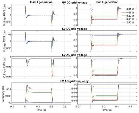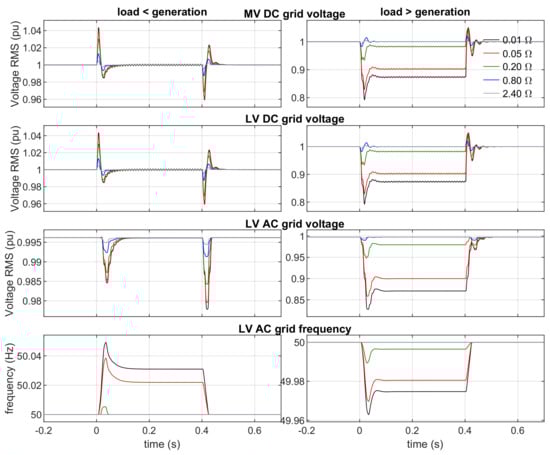 The elimination of the excessive net load in the hybrid AC/DC grid is performed by the combined actuation of , and signals. The and signals are set to 1 in normal conditions () or during excessive net generation in the hybrid AC/DC grid (). As a result, the transformation ratio in the isolated DC/DC converter remains in its default value (), and the electronic resistor (described in Section 2.1.3) is not actuating (the voltage in the MV DC grid () follows the voltage in the MV DC bus ()). When , reduces the transformation ratio in the isolated DC/DC converter and controls the electronic resistor to insert a series resistance in the connection point of the MV DC grid with the ST’s MV DC bus. As a result the voltages in the LV DC grid () and MV DC grid () are reduced, according to Equations (28) and (29) respectively.