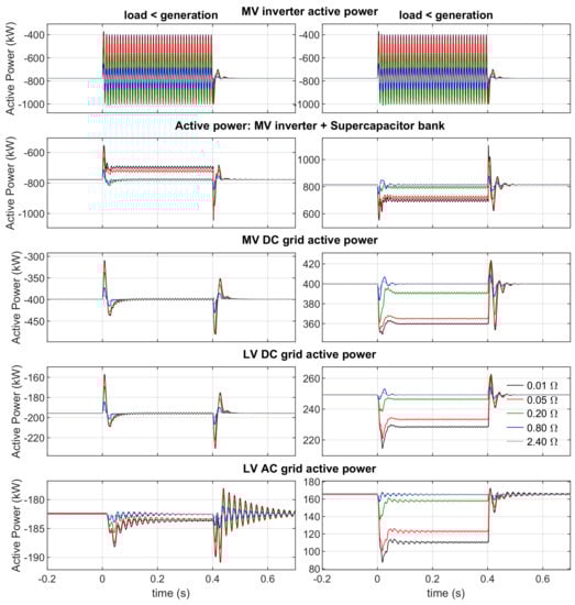 To avoid the drawbacks of the aforementioned solutions, an electronically controlled supercapacitor bank, described in Section 2.1.5, was incorporated as part of the proposed FRT strategy. Besides preserving the transferable power in the ST’s MV inverter, it also preserves the dynamics of the ST because it only actuates against power oscillations associated to the negative-sequence component, as explained in Section 2.1.5. Based on [41], the maximum voltage ripple () for the ST’s MV DC bus voltage can be expressed by Equation (26), where M is the modulation index of the ST’s MV inverter, is the maximum amplitude of the active power oscillation associated to the negative-sequence component of the MV AC grid voltage, is the MV AC grid frequency, is the maximum amplitude of the negative-sequence component of the MV AC grid voltage, and are the capacitances of the ST’s MV and LV DC buses respectively, is the capacitance of the supercapacitor bank, and is the supercapacitor bank voltage.