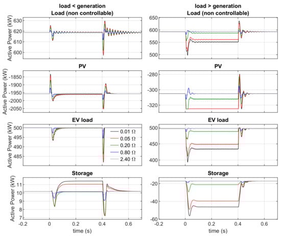 Not being object of study in this paper, reactive power is not considered in the DER units available in the LV AC distribution grid. Thus, the generated reference current () represents only the direct current component. PV generation and the ESS in the AC network incorporate an active power–frequency droop () in order to respond to the frequency deviations induced by the FRT Control described in Section 3. The ESS in the AC network also incorporates an active power–voltage droop () in order to respond to voltage modulations originated by the FRT Control. PV generation in DC networks incorporates an active power–voltage droop (P(VDC)) in order to respond to the voltage deviations induced by the same FRT Control. PV generation operates with 10% of deloading reserve, which is activated in case of under-voltage (DC networks) or under-frequency (LV AC network).