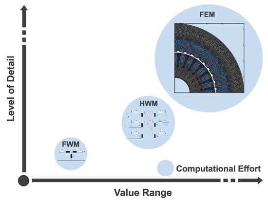 Different models are used for modeling and calculating the individual components and their domains, depending on the required accuracy and the physical effects to be modeled. The individual models therefore differ in their value range and level of detail of the representation of the physical effects as well as in their computational or solution effort. They can be classified into the categories of empirical, analytical, lumped parameter, and numerical models. The exemplary classification in value range, level of detail and computational effort for models for the electromagnetic simulation of an Induction Machine (IM) used in this paper are shown in Figure 1. Analytical models such as the Fundamental Wave Model (FWM) or Harmonic Wave Model (HWM) have a smaller value range of modeled physical effects and a lower level of detail of individual effects than numerical models such as the Finite Element Method (FEM), but also a lower computational effort.