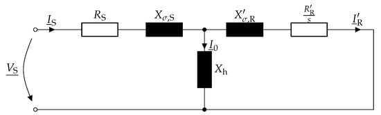 Modeling of a squirrel cage IM in the FWM is performed using the single-phase Equivalent Circuit Diagram (ECD) presented in Figure 2. In this paper, the T-ECD is used, which allows the consideration of saturation in terms of a current-dependent main inductance. The use of a stator flux or rotor flux based ECD is also possible but is not applied here. The ECD is composed of the stator resistance , the rotor resistance divided by the slip s, the leakage reactances and , and the main reactance . The rotor-side quantities related to the stator by the transmission factor are thereby characterized by a. For the calculation of these elements of the ECD, which can be derived exclusively from the machine geometry and constant parameters, reference is made to the literature [7]. Important physical quantities and effects which affect the range of values or the level of detail of the machine modeling are briefly explained.