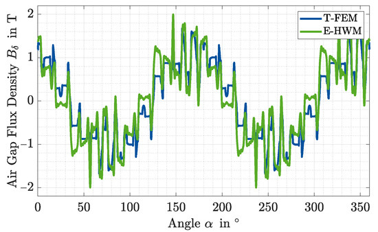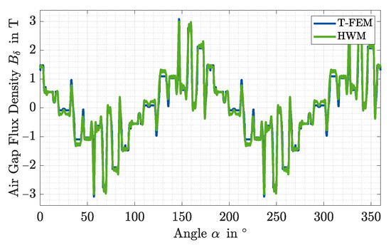 by which the inductances are multiplied. Based on the scaled inductances, the rotor current can be updated. By integrating a relaxation factor, the convergence behavior of the successive substitution can also be improved. In Figure 5 the same operating point of an exemplary IM as in Figure 3 is simulated using non linear magnetic material properties. The air gap flux density compared to the linear material in Figure 3 differs strongly. Nevertheless, the use of the E-HWM makes it possible to simulate the saturation-dependent flux density approximately well.