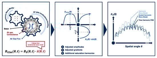 If the influence of the iron saturation on the harmonics is to be considered, the flattening of the hysteresis curve in the nonlinear region and the resulting flattening of the air gap flux density must be modeled, which is shown for the idealized case of a sinusoidal air gap flux density in the middle plot of Figure 4. This can be realized mathematically by a circumferential location dependent description of an effective air gap. Here, as a consequence of the main field saturation, the air gap is increased on average by a saturation factor . In the region of large iron saturation, i.e., at the maximum of the air gap flux density , the air gap is increased by another saturation factor and decreased at zero crossings. Thus, the time- and location-dependent air gap conductance function shown in the left plot of Figure 4 can be defined. This moves synchronously with the fundamental wave field and therefore results in