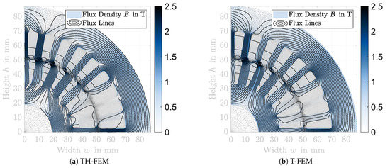 In Figure 6 the simulated magnetic flux density of an exemplary IM at an saturated operating point is shown. In Figure 6a the simulation was conducted using the TH-FEM and in Figure 6b using the T-FEM. The simulation results show quite similar field characteristics.