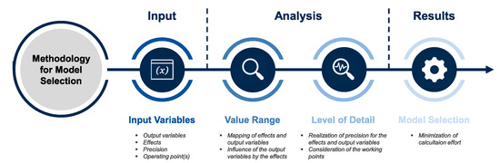 The four-step generic procedure of the approach for model selection is shown in Figure 7. The problem definition is based on four input variables. These describe the searched output quantities, the effects to be investigated are whose influence on the output quantities is to be modeled, and the respective required precision, i.e., the problem-specific level of detail. Since the precision of the models depends on the operating point, a selection of the operating points to be considered is also necessary. The problem-specific output quantities to be considered define the electromagnetic coupling quantities for a coupled model. Analogously, the effects to be studied describe the external coupling variables. By means of this problem definition, suitable models can be derived on the basis of the value ranges and levels of detail of the available models and simulation methods, respectively. From the consideration of the value range the possible models follow, which represent all output quantities and effects and can model an influence of the output quantities by the effects. For the possible models, the required level of detail is examined in the following step and the suitable models that meet all requirements are derived from this. From these, the one with the lowest computational effort is selected.