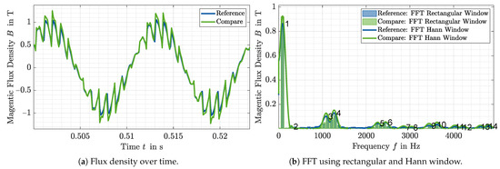 - Temporal and Spatial Characteristic: The precision of temporal and spatial characteristic, such as the magnetic flux density in the stator tooth over time or the magnetic air gap flux over time or position, is determined with reference to the simulation results of the T-FEM. For each characteristic, an exemplary operating point in the linear range and one in saturation are analyzed. The analysis is performed on the basis of the frequency spectrum of the considered quantity. Spatial characteristics, such as the spatial characteristic of the air gap flux density, are decomposed into their spectral components using the Fast Fourier Transformation (FFT) with a rectangular window. The level of detail is then separated into three subcategories. The precision of the fundamental wave, the precision of the harmonic amplitudes, and the precision of the occurring frequency orders. The slip dependence of an operating point during the operation of the IM leads to the fact that frequency components occur in the time variables which do not correspond to an integer multiple of the fundamental frequency. The use of a rectangular window in the FFT therefore leads to large spectral leakage. Therefore, a window function is used for the temporal quantities, which reduces the spectral leakage. A suitable window function is the Hann window. Figure 8a shows an example of the temporal course of the air gap flux density simulated by means of two different models at a particular position in the air gap. In Figure 8b the frequency spectra are plotted by means of a FFT with a rectangular window and by means of a FFT with a Hann window. To determine the level of detail, the output signal of the FFT with the Hann window of the reference signal as well as that of the comparison signal are analyzed for their local maxima. From the local maxima which are larger than a certain threshold value, the level of detail of the fundamental, the amplitudes of the harmonics and the occurring frequencies are then determined, as in the case of the location-dependent characteristics. In Figure 8b the maxima used to analyze the level of detail are marked with numbers.