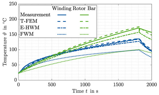 Simulated and measured stator winding and rotor bar temperature of the exemplary IM using the T-FEM, the E-HWM, and FWM.
