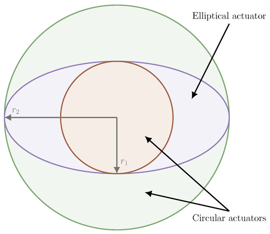 The DEAP actuator models have been widely studied in the literature [1,6,18,19], showing the most significant phenomena in these devices. This work applies the knowledge of these works to analyze the proposed elliptical actuator. The mass biased actuator was chosen for simplicity of biasing mechanics [6]. However, it is also possible to apply the proposed work with different bias mechanics [15,16,19]. The aim is to model the elliptical actuator as an extension of the circular one. The elliptical shape actuator model was defined using two circular model actuators (), as presented in Figure 1. The approximation was based on the use of a model consisting of two circular actuators with radii corresponding to the minor () and major () semi-axis of the elliptical actuator.