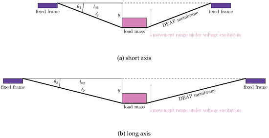 The variables for the undeflected state (without applied mass and voltage) are given by and , which are the membrane initial thickness and the electrode width. The membrane is assumed to be the same for all elliptical shapes (with circular prestretch); therefore, the initial thickness is common for both models. The electrode width depends on the length of minor/major semi-axis; hence, it must include the index of the actuator. In the case of the deflected state (with applied mass or voltage), the variables are and . In this case, both variables are different due to different stretch for small and large circular actuators. The function is applied to clarify the notation. To simplify the analysis of relationship, the cross-sections of both actuators (for short and long axis) are presented in Figure 2. It is assumed that both actuators move over the same distance y because they express the single elliptical actuator. However, it is worth pointing out that angles will be different for both axes: