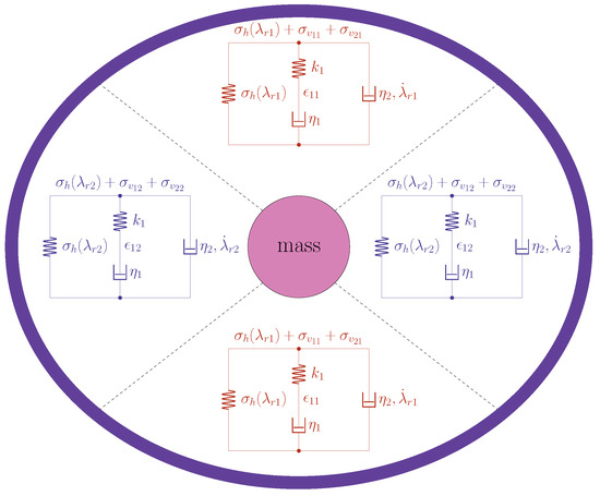 The phenomenon of viscoelasticity of the individual circular cylinders was modeled by a series connection of a viscous damper and an elastic spring () and the viscous damper () connected parallel to them, as presented in Figure 3.