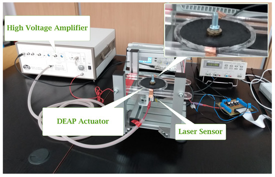 The experiments were performed on the following hardware: a high voltage amplifier TREK MODEL 10/10B-HS, a laser distance sensor Micro-Epsilon optoNCDT ILD1320-10 with 1 accuracy, and an Inteco RT-DAC/USB data acquisition card. The laboratory set-up is presented in Figure 6. The system was measuring data with a probe time of 1 .