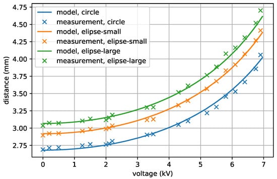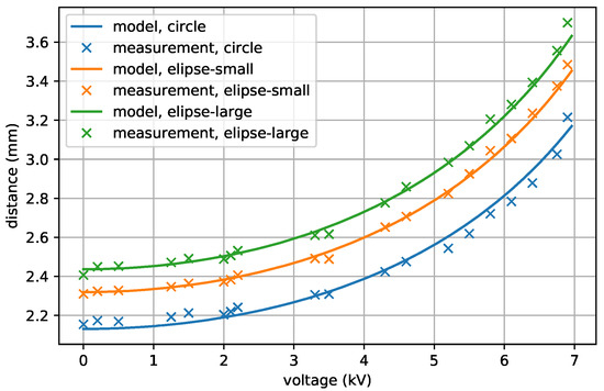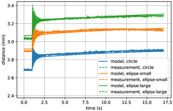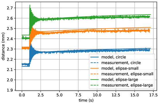 The actuator displacement measurements were carried out for the range 0w–7with loads of and . After changing the voltage, there was a 30 s wait before the actuator displacement was stabilized. The steady state responses of distance obtained for the following voltages were used to optimize the parameters of the Ogden model, the weight coefficients and relative permittivity. The SciPy python package [21] was used to run a Nelder–Mead simplex algorithm which efficiently found the optimal parameters. The values of the obtained parameters are presented in Table 1. The figures illustrating the comparison of models and measurements for three different actuators and two values of additional masses prove that the values obtained in the process of identifying static parameters are correct (Figure 7 and Figure 8). The experiments take into account the pure mechanics at the points of zero supply voltage. This applies to both analyzed weights 17.9 and 22.45 g. The process of identifying static parameters (hyperelastic model coefficients and relative permittivity) took place for all parameters simultaneously. This approach allowed us to perform only one optimization. This approach is in line with the literature [19]. It is worth pointing out that the placement of the distance versus voltage characteristics is correlated with the shape of the actuators. It can be seen that the large elliptical actuator is more sensitive for the same mass than the circular or small elliptical actuator.