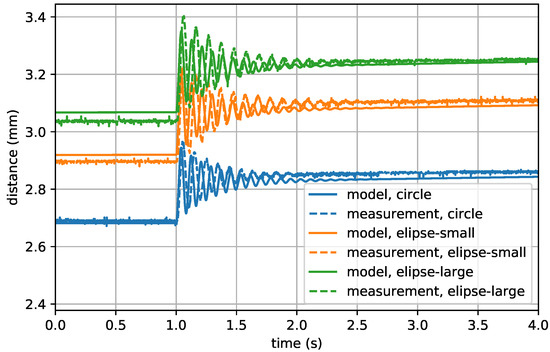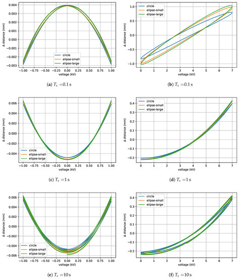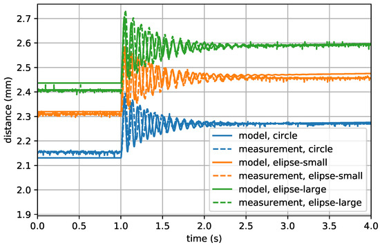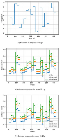 In this section, a quantitative comparison between different shapes of actuators is described. To make said comparison, the random step responses with a voltage level between 0 –7 with switch every 30 were applied to actuators. The excitation and responses are presented in Figure 14. Further, for all responses, the difference between the minimal and maximal distances were measured. The results are presented in Table 2. The actuator large elliptical actuator has the larger movement range for both masses. It can be seen that the elliptical shape increases the moving range compared to the circular shape.