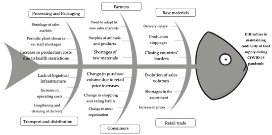 Names of the individual components of the Ishikawa diagram, i.e., 5 M’s + E principle were adjusted to the specifics of the analyzed markets, similarly to studies by other authors [98,99,100]. The fishbone head presents the problem to be solved, which is the difficulty of maintaining a sustainable food supply chain during COVID-19 pandemic and the backbone fish describes the main causes. The fish backbone illustrates the causes influencing the analyzed problem, which in chronological order, are: raw materials, farmers, processing and packaging, transport and distribution, consumers, and retail trade. Each cause is co-developed by three prime causes. In our Ishikawa fishbone diagram, the ordering of the prime causes is two-fold. The root cause closer to the backbone is more important, as indicated by the larger font size. Each category of causes is expanded to include further specific causes. The expansion of the diagram is completed because the phenomenon is fully identified.