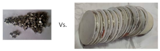 Next, a main aspect of the concept here proposed is to use larger element assemblies (Figure 2), something that has rarely been done before, possibly because larger elements tend to yield lower voltages per unit power and higher currents. This might be a challenge for small systems, but not so much for larger ones. This large element configuration may allow for high power densities (We/m2) and drastically reduces the degree of complexity of the assembly: there is a drastic reduction in the number of pairs, cuttings (dicing process), connections and solders per unit power and per unit area. The bigger scale of the elements and their spacing will also allow for much coarser manufacturing tolerances. Manufacturing cost is inversely proportional to tolerance, so this will allow for much simpler and much cheaper manufacture/assembly processes []. Under these circumstances, dissimilar thermal expansion of the p- an n-elements will not be such a problem, as in the case of tightly packed small elements. Being large, the aluminium connectors will be able to more easily conform to the thermal expansions without creating the critical thermal stresses that would be much stronger in tightly packed small element modules. All these factors will favour an easier scalability (upscaling) of the concept. Moreover, the use of a round geometry may be advantageous to eliminate manufacturing processes, as many material manufacturing processes, such as hot press, already produce large round-shaped pellets that could be directly used as elements without the need for the element dicing process.