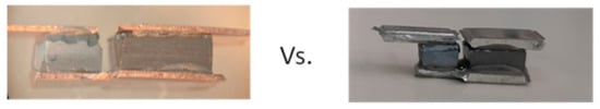 Next, a practical and affordable connection process is proposed, consisting of cheaper aluminium connectors instead of copper ones and using nickel or silver paints for electrical connection instead of solders, which would be easily upscalable (Figure 3 displays an example of the copper and aluminium connectors that were successfully applied to the mentioned materials by the authors).