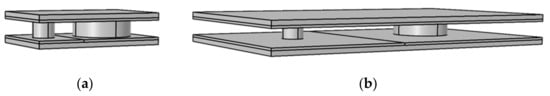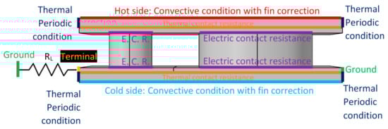 The external load resistance consumes the useful power produced by the TE pair and is used to quantify this power. RL affects the generated current. It is incorporated into the model as a generic electrical resistor connected in series to the pair via one of the boundaries identified as “terminal” and it is also connected to the ground (reference zero voltage), as seen in Figure 6. Similarly to what was published by the authors for the case of the conventional geometry modules [], matched load conditions were imposed. These conditions correspond to the condition under which the generated power is maximized. This happens when the load resistance coincides with the internal resistance of the TEG. Since the electrical conductivity of the materials is a function of temperature, the internal resistance of the pair was recalculated at each iteration by integration and the electrical load resistance was updated accordingly.