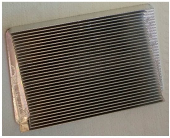 Heat exchangers often make up for one of the most expensive portions of TEGs []. A viable option would be to adapt existing extruded aluminium profiles such as the one displayed in Figure 5 to be used as heat exchangers. These finned blocks are available commercially in various shapes. Since the cost of the aluminium extrusion process is mostly linked to the extrusion matrix, using existing commercial profiles will be a suitable way of obtaining large heat transfer areas at a low cost. Densely finned heat sinks usually used for air cooling [] may be easily adapted for liquid cooling, providing a cheap and ultralow thermal resistance option for cooling the cold side of the TEGs, which often deprecates the performance of real-world TEGs. Normally, fins are most needed to reduce high thermal resistance heat paths []. This surely is the case with gaseous convection, often occurring at the hot side. However, if power output is to be maximized, fins might be justified even in liquid cooling situations [,], as they will allow one to substantially reduce the coolant flow and the corresponding pumping power needs while maintaining or even reducing the thermal resistance as compared to finless liquid cooling with higher flow rates. One way of adapting commercial extruded finned surfaces to liquid cooling would be to seal them with a welded or bonded cover and add inlet and outlet hoses like the authors did for a different TEG (Figure 5).