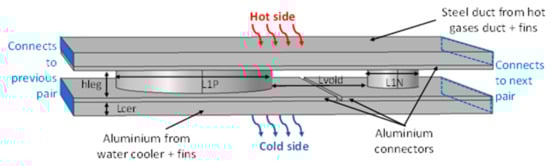 The p-type element diameter (L1P) was fixed at the maximum diameter that the authors’ hot press machine is able to manufacture (24 mm). The n-type diameter (L1N) varied between 1 and 15 mm. Outside of these bounds, the results were no longer promising, so the simulations were kept within these limits. The spacing between elements (Lvoid) was varied between 1 and 20 mm. The thickness of the legs (hleg) was varied between 1 and 10 mm. The connectors were made of cheap, high conductivity aluminium and the surfaces of the heat source and heat sink ducts have been included so that the 3D heat transfer effects that might occur across those walls may be correctly included in the modeling. A steel duct was considered for the hot side, while an aluminium one was chosen for the cold side, corresponding to the material of the cooling plates.