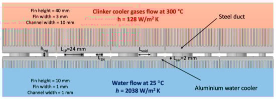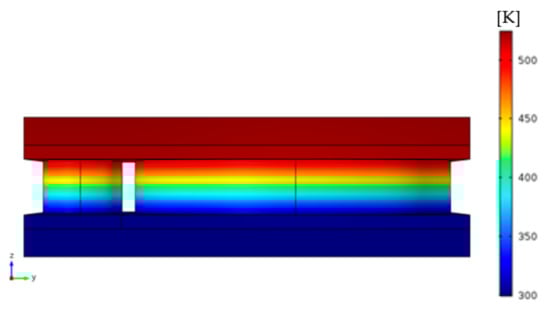 Regarding the thermal boundary conditions, the following approach was tested: a thermally enhanced situation was considered (Figure 8), which assumes that there are heat exchangers displaying finned surfaces at both the heat sink and the heat source boundaries to reduce thermal resistances, thus allowing one to obtain higher temperature differences across the TE elements, maximizing the Seebeck effect.