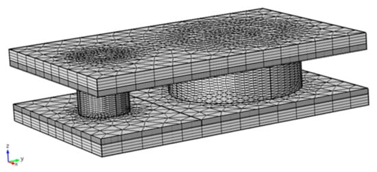 The maximum convergence error was set at 1 × 10−12. Segregated steps were eliminated so that the solution was simultaneous. The mesh size was optimized to allow for the simulation of a big number of cases while still providing negligible error. Figure 9 displays the mesh used. The meshing process followed several steps. First, a base mesh size with the “extra fine” configuration was set for all the domain. This meant a maximum/minimum element size of 1.9 mm/80 μm and a maximum element growth rate of 1.35 (prior to refinements). Next, the mesh at the TE elements was set with free tetrahedral elements and with a scaling factor (refinement) of 4 in the direction of the thermal flow (z axis). A free triangular mesh was applied to the connector inner surfaces with a scale factor of 0.5 (coarser) in the horizontal plane (x and y axes). This was followed by a mesh sweep based on the triangular mesh with a fixed distribution of four elements in the z direction both for the connector and the metal outer walls, as can be seen in Figure 9. Refinements were also made in the vicinity of edges between the elements and the connectors, since these are the regions displaying the strongest thermal and electrical gradients. The mesh independence was also studied, and the degree of refinement used far exceeded the threshold where the variation of the results was noticeable.