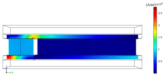 Figure 12 Displays current density at the mid plane of the TE pair, showing the higher current density at the connectors, between the n and p elements.