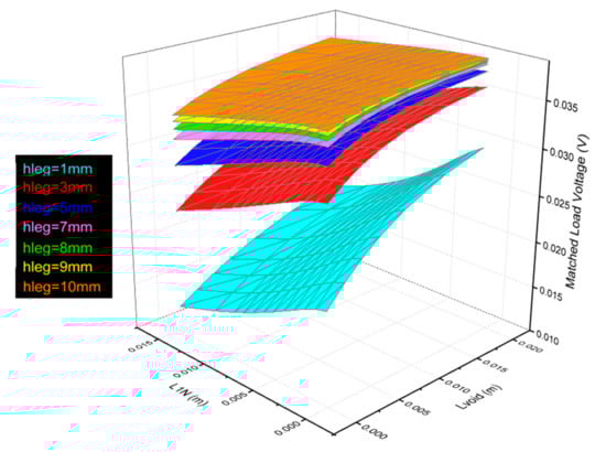 Now, the global performance is assessed. Figure 13 displays the matched voltage per TE pair as a function of the n-type diameter (L1N from 1 to 15 mm), and element spacing (Lvoid from 1 to 10 mm), for several element thicknesses, hleg (from 1 to 10 mm). It may be seen that the voltage always decreases when L1N increases. Voltage is a function of the temperature difference at the element junctions through the Seebeck effect. Therefore, this happens because the increase in L1N diameter decreases the thermal resistance of the pair and when this happens, the heat flux increases. Thus, the temperature difference at the element junctions will also decrease. The same voltage drop happens when decreasing the leg thickness (hleg) for the same reason (lower thermal resistance, higher heat flux, deprecated temperature difference). Increasing the spacing between elements (Lvoid) increases voltage because each element will have a larger area for heat transfer, which decreases thermal resistance. This causes a higher available temperature difference across the hot and cold junctions.
