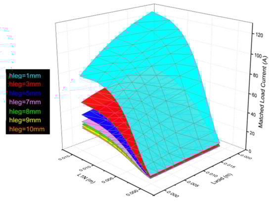 Figure 14 depicts the matched load current as a function of the same parameters. It has the opposite trend of voltage: it increases when hleg decreases and when L1N increases. This can be explained by several factors. On one hand, since the current is induced by the Seebeck voltage, it naturally increases when this parameter increases. However, the matched current is also dependent on the electrical resistance of the pair, so these two factors have opposite contributions. When increasing the n-type element section area or decreasing the TE element thickness, the electrical resistance decreases; thus, the current increases for a given voltage. This effect is apparent when comparing the currents of pairs with the same leg geometry but different Lvoid. Since higher Lvoid promotes the Seebeck voltage (recall Figure 13), it will also promote higher currents.