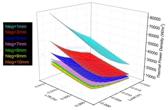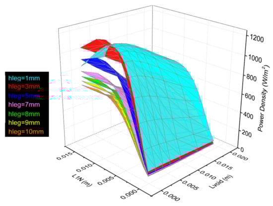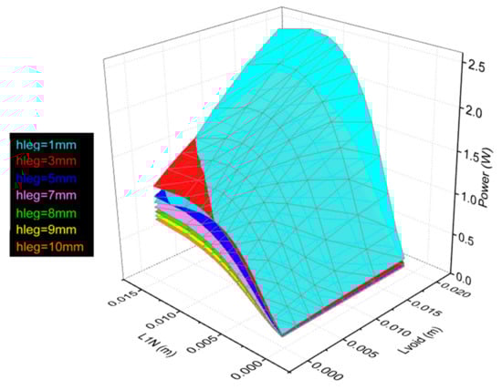 While the maximum power tends to be obtained for the lower range of thicknesses, the following must be noted: it is risky to choose geometries in which the thickness is too low due to physical integrity concerns and due to the higher risk of power degradation in the presence of factors unaccounted for, such as electric and thermal resistances higher than expected (e.g., higher contact resistances) []. Therefore, the use of the lower range of hleg is not recommended.