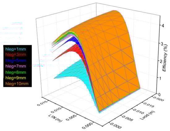 Finally, it is important to assess the conversion efficiency of the system, as displayed in Figure 18. It may be seen that while Lvoid is only mildly important, peak efficiency is obtained for n-type element diameters between 7 and 9 mm and for the higher range of thicknesses. The reason for this is that larger thicknesses induce higher thermal resistances, which is beneficial for maximizing the temperature differential across the hot and cold junctions responsible for the Seebeck voltage. However, it was already seen in Figure 16 that the power density is maximized for the lower range of element thicknesses. Therefore, a good balance between these parameters needs to be achieved.