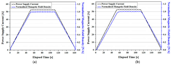 Figure 3 shows the charging/discharging test results for these HTS coils. The HTS coils were charged up to 52 A, which is about 70% of the coil’s critical current, and after reaching the target current, the current was maintained for about 1 min and then discharged. In the charging/discharging sequence, the ramping up/down speed of the power supply current was set to 1 A/s, and the change in the magnetic field was measured using a hall sensor installed in the center of the coil. Figure 3a shows the test result of the insulated HTS coil, where the power supply current and magnetic field match relatively accurately during the charging and discharging. On the other hand, the test results of the no-insulation coil in Figure 3b do not match the graphs of the power supply current and the magnetic field, especially in the discharging sequence. This is due to the leakage current in the contact direction between winding turns, which causes the slope of the magnetic field graph in the charging/discharging sequence to be smaller than that of the insulated HTS coil. Additionally, the effect of partial insulation can be examined through Figure 3c,d. Figure 3c is a test result in an HTS coil with an insulating tape inserted once every eight turns, and it shows that the slope of the graph of the magnetic field in the charging/discharging sequence is increased compared to that in the no-insulation. Figure 3d is the test result for the HTS coil in which the insulating tape is inserted once every four turns, and the charging/discharging delay problem is further improved. These experimental results show that as the number of insulating layers increases, the charging/discharging delay problem is improved. However, although it is not within the scope of this study, this method weakens the self-protection properties, so it is necessary to study to find suitable conditions for the application.
