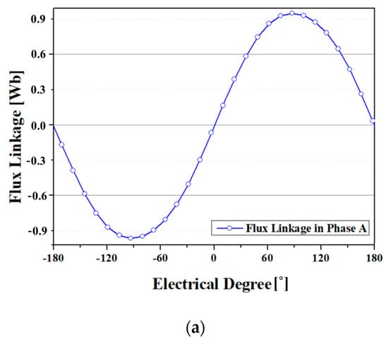 In this section, the steady-state characteristics of the designed HTS HSM after the HTS field coil is fully excited were analyzed and investigated. Figure 13 shows a simulation result on the magnetic field distribution, and Figure 14 shows the simulation results on the flux linkage, no-load voltage, and phase voltage/line current in a resistive load condition, respectively, performed to examine characteristics in generator mode. In the simulation of phase voltage/line current in a resistive load condition, given that motion of the rotor starts immediately after the current in the HTS coil is fully excited, the output value differs for each phase up to about 15 ms due to the transient response (step response) component. From the simulation results, it is confirmed that the designed HTS HSM generates an output power of 110 kW in an operating condition. Additionally, it can be seen that the HTS HSM to which the NI HTS field coil is applied has the same operating characteristics as the HTS HSM to which the insulated HTS field coil is applied under normal operating conditions after the HTS field coil is fully excited.