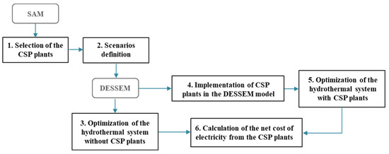 The analysis of the economic feasibility of the CSP plants, considering their benefits to the electricity system, was carried out in six steps (Figure 1): (1) selection of the CSP plants, (2) scenario definition, (3) optimization of the hydrothermal system without CSP plants, (4) implementation of the CSP plants in DESSEM, (5) optimization of the hydrothermal system with CSP plants, and (6) calculation of the net cost of electricity from the CSP plants.
