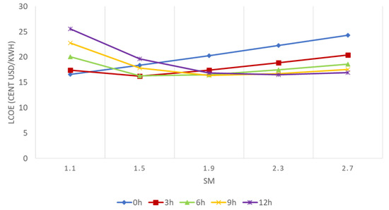Figure 2 shows the LCOE of the CSP plants for the various values of SM and storage hours. The CSP plant with SM equal to 1.5 and the 6 h TES system was selected because the influence of the solar multiple in the LCOE is lower for the 6 h TES system than for other TES sizes and also because it showed the lowest levelized cost for the CSP plant.