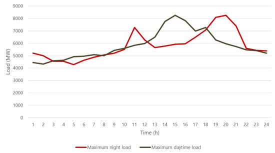 In step 2, four typical 1-day scenarios were built: (i) a wet/night scenario, (ii) a wet/day scenario, (iii) a dry/night scenario, and (iv) a dry/day scenario. The first two scenarios represent the hydrothermal system on a day in January (wet season), with maximum loads at night and during the day, respectively (Figure 3), while the last two scenarios denote the hydrothermal system of a day in August (dry season), with the same load profiles as those in the wet season scenarios.