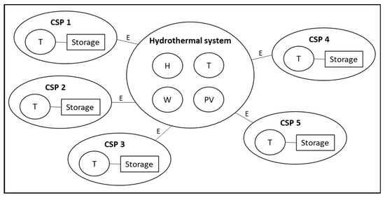 Inclusion of CSP plants in the hydrothermal system. H, hydroelectric plants; T, thermoelectric plants; W, wind farms; PV, solar PV power plants; E, energy exchange.